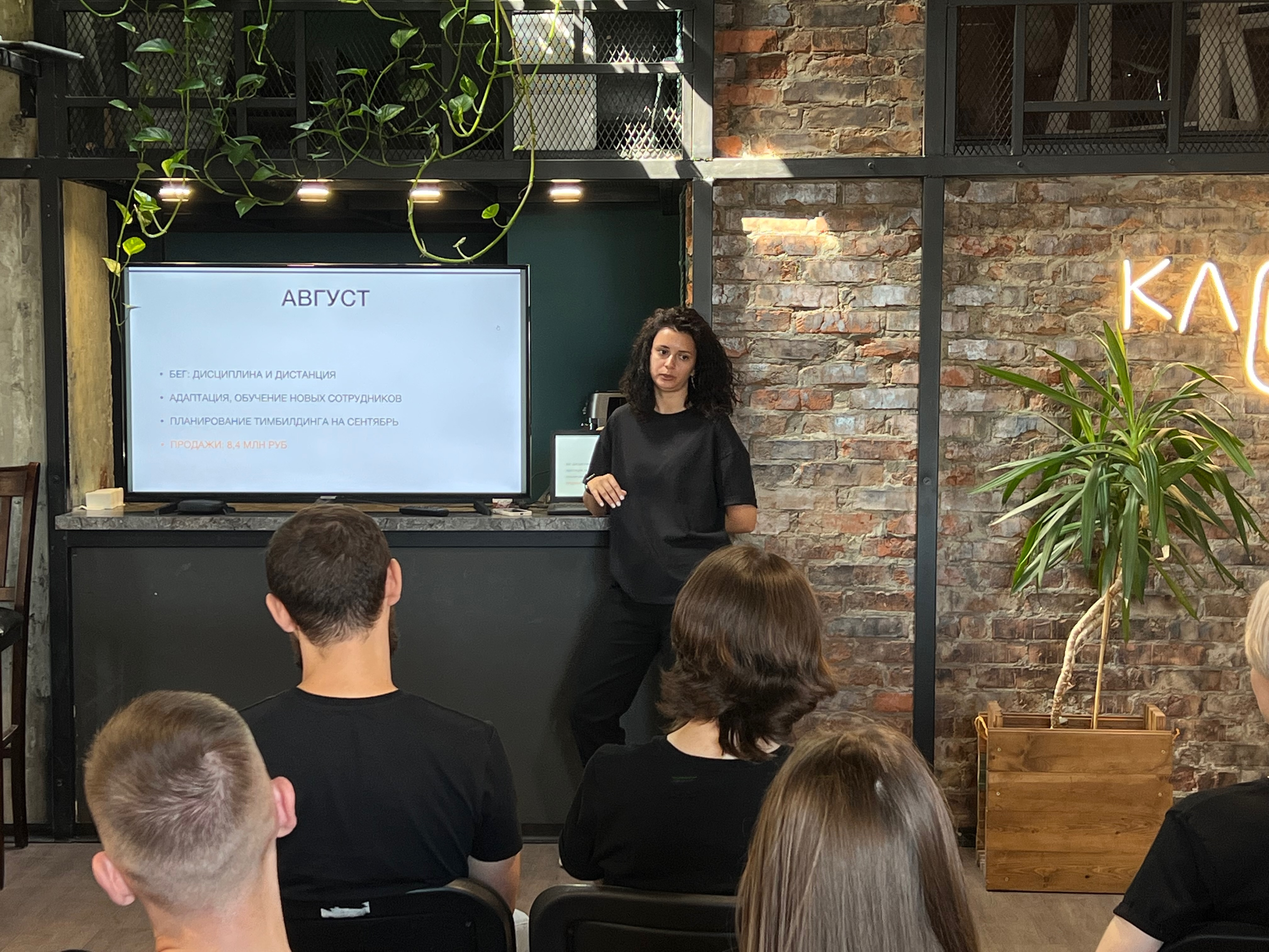 Выступление HR Алены. У HR большой успех - в июле закрыли позицию директора по маркетингу, руководителя продаж ЦОК1 и два новых менеджера в отдел B2B. Из интересного: применили новую стратегию. Решили брать в команду молодых ребят без опыта и учить. И это сработало. Пока радуемся результатам.