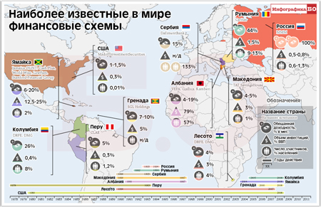 Для России финансовые мошенничества на заре рыночной экономики были в диковинку. За рубежом они столь же стары, как и сам капитализм. Международный опыт насыщен разного рода схемами, будь то игра на акциях, прямых инвестициях, облигациях, недвижимости, автомобилях и даже вертолетах. Разнообразие схем ограничено только воображением преступников и легковерием инвесторов. В ходе финансового кризиса большинство схем всплыло «брюхом кверху». Самая громкая, нашумевшая схема в США под вывеской Madoff Investment Securities, продержалась много лет и обошлась инвесторам в 50 млрд долларов, а ее создатель, Бернард Мэдофф, приговорен к 150 годам тюремного заключения.