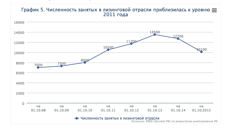 В целях снижения давления на рентабельность бизнеса лизинговые компании вынуждены были проводить оптимизацию расходов. Как правило, компании урезали бюджеты на маркетинговые услуги, ИТ-обеспечение, стратегическое и оперативное управление. Большое внимание было уделено оптимизации расходов на содержание сети структурных подразделений. Произведено сокращение региональных подразделений с невысокой эффективностью, а головные офисы переведены в помещения с меньшей арендной платой. Произошло значительное сокращение сотрудников: по оценке Агентства, за последние два года численность занятых в лизинговой отрасли сократилась почти на 25% и составляет на текущий момент около 10,1 тыс. человек.