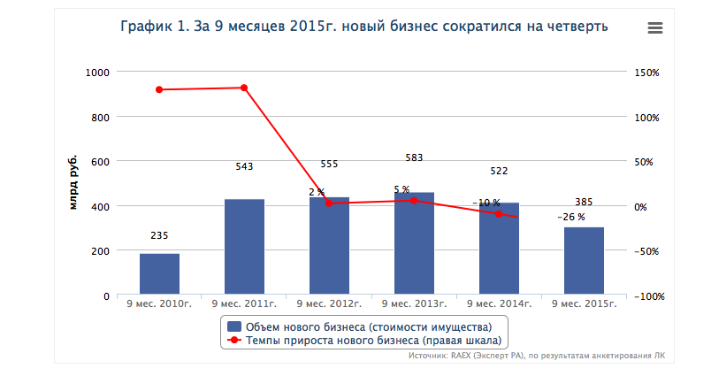 | Объем нового бизнеса (стоимости имущества), млрд руб. | 555 | 770 | 583 | 783 | 522 | 680 | 385 |