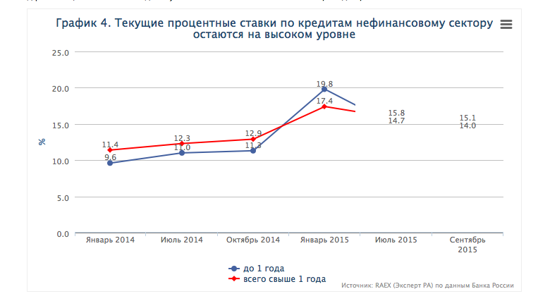 Спад в экономике России привел к заморозке проектов по обновлению основных фондов, вследствие чего падение спроса на лизинг длится с 2013 года. Дополнительный удар по спросу клиентов нанесло повышение ключевой ставки Банком России в конце прошлого года. Несмотря на ее постепенное снижение, ставки по кредитам нефинансовому сектору, в т.ч. лизинговым компаниям, остаются на высоком уровне относительно докризисной ситуации (график 4). Высокая стоимость заемных средств снижает экономическую привлекательность лизинга для потенциального клиента и приводит к сокращению новых лизинговых договоров и маржинальности лизингового бизнеса. По оценке Агентства, за прошедшие 12 месяцев средняя маржа (разница между величиной ставок по лизинговым платежам и привлеченным средствам под реализацию лизинговой сделки) лизинговых компаний снизилась 4,3% до 3,7%.