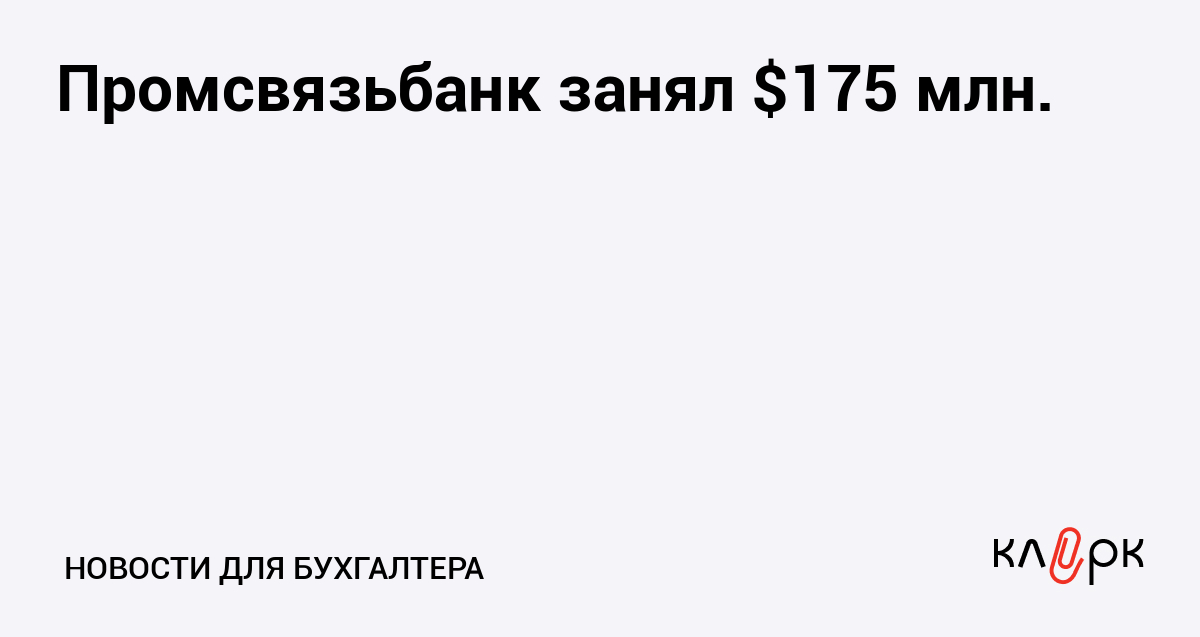 Промсвязьбанк завершил сделку по привлечению синдицированного кредита. Кредит на сумму 175 млн. долларов привлечен сроком на 12 месяцев. Первоначально запланированный объем сделки - 150 млн. долларов. Ставка привлечения составляет Libor + 1%.