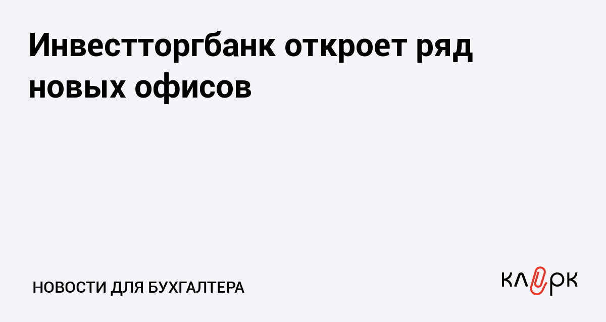 До конца текущего квартала Инвестторгбанк откроет ряд новых офисов. В течение августа-сентября 2008 года дополнительные офисы банка появятся в Саратове и Энгельсе Саратовской области, Санкт-Петербурге, Старом Осколе Белгородской области, Набережных Челнах и Калаче-на-Дону.