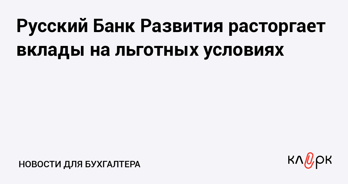 С 24 октября по 30 ноября 2008 года Русский Банк Развития запускает во всех дополнительных офисах Москвы акцию для физических лиц. В рамках акции клиенты банка, имеющие открытые вклады в рублях и желающие досрочно их расторгнуть, смогут сделать это на льготных условиях.