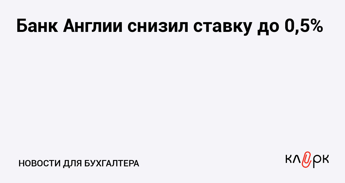 Банк Англии 5 марта понизил процентную ставку на 0,5 процентного пункта до 0,5%. Текущий уровень ставки британского ЦБ стал новым историческим минимумом, отмечает ИА "РосФинКом".