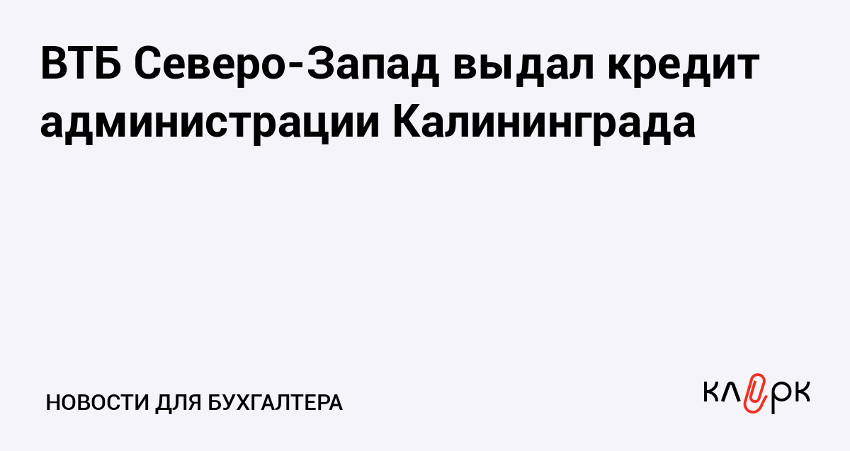 Банк ВТБ Северо-Запад предоставил кредит администрации города Калининграда. Кредит в размере 200 млн. рублей выдан сроком на 1 год, сообщает пресс-служба банка.