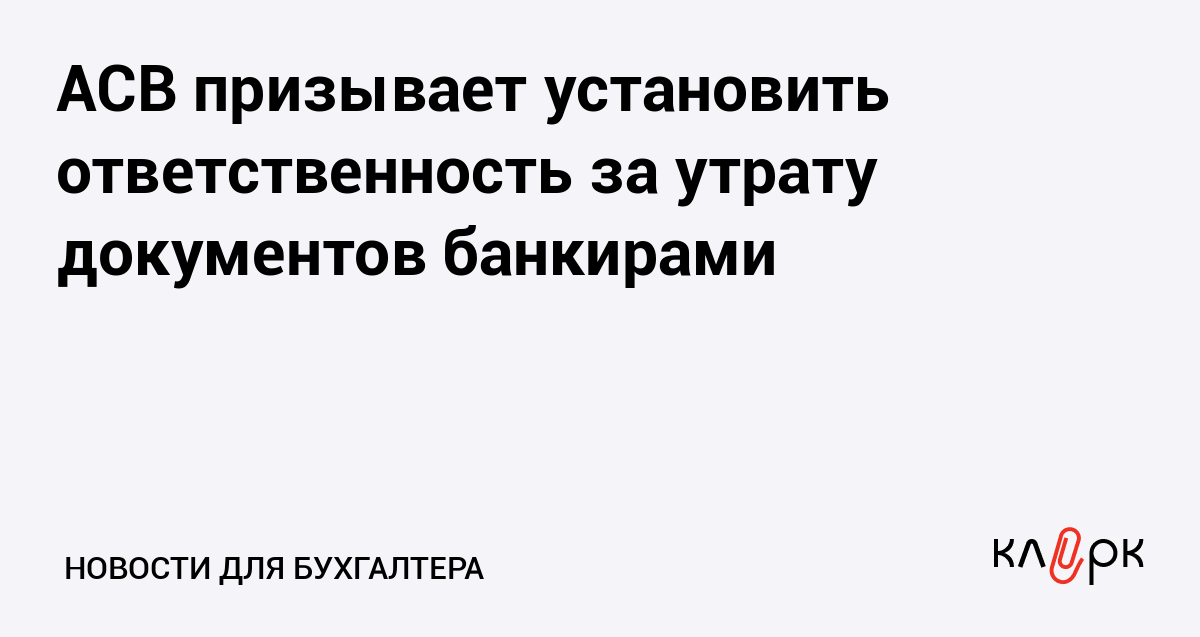 Глава Агентства по страхованию вкладов Александр Турбанов предлагает установить ответственность за утрату и фальсификацию банковских документов и отчетности. По его словам, АСВ уже неоднократно сталкивалось с ситуациями, при которых банки-банкроты не могли предоставить необходимый пакет документов, передает агентство РАПСИ.