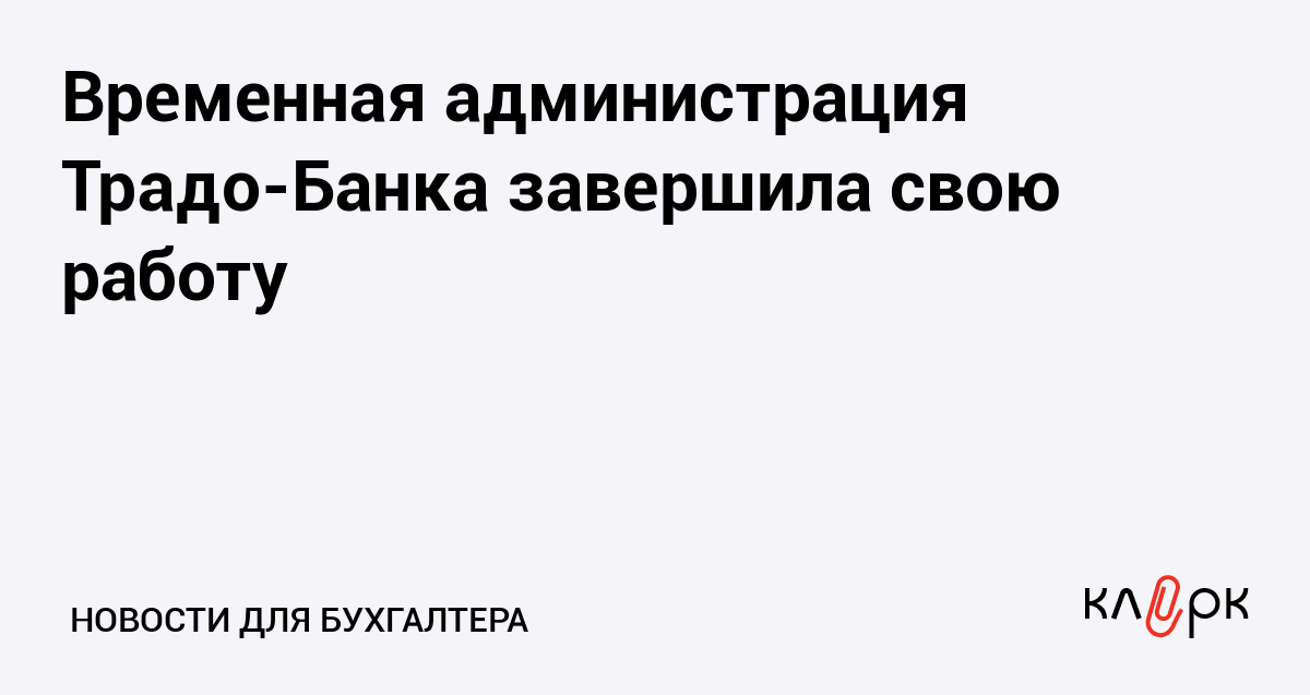 С 4 марта прекращена деятельность временной администрации по управлению московской кредитной организацией ЗАО АКБ «Традо-Банк». Решение принято Банком России в связи с тем, что московский Арбитражный суд признал эту кредитную организацию банкротом и назначил конкурсного управляющего. Об этом сообщает департамент внешних и общественных связей Банка России.