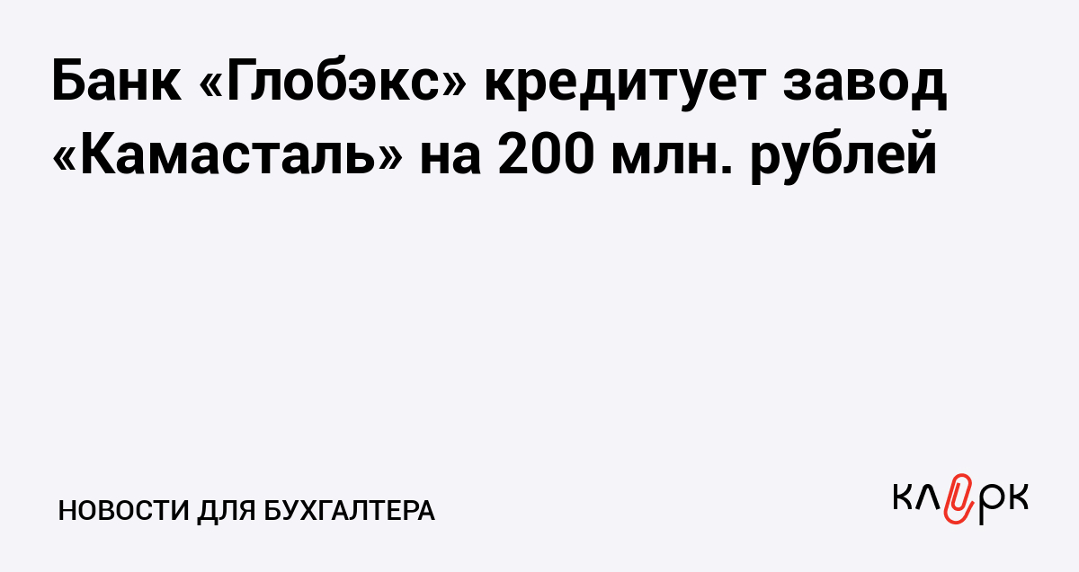 Банк «Глобэкс» открыл кредитную линию объемом 200 млн. рублей металлургическому заводу «Камасталь», дочернему предприятию холдинга «Мотовилихинские заводы». Кредит предоставлен сроком на 1 года.