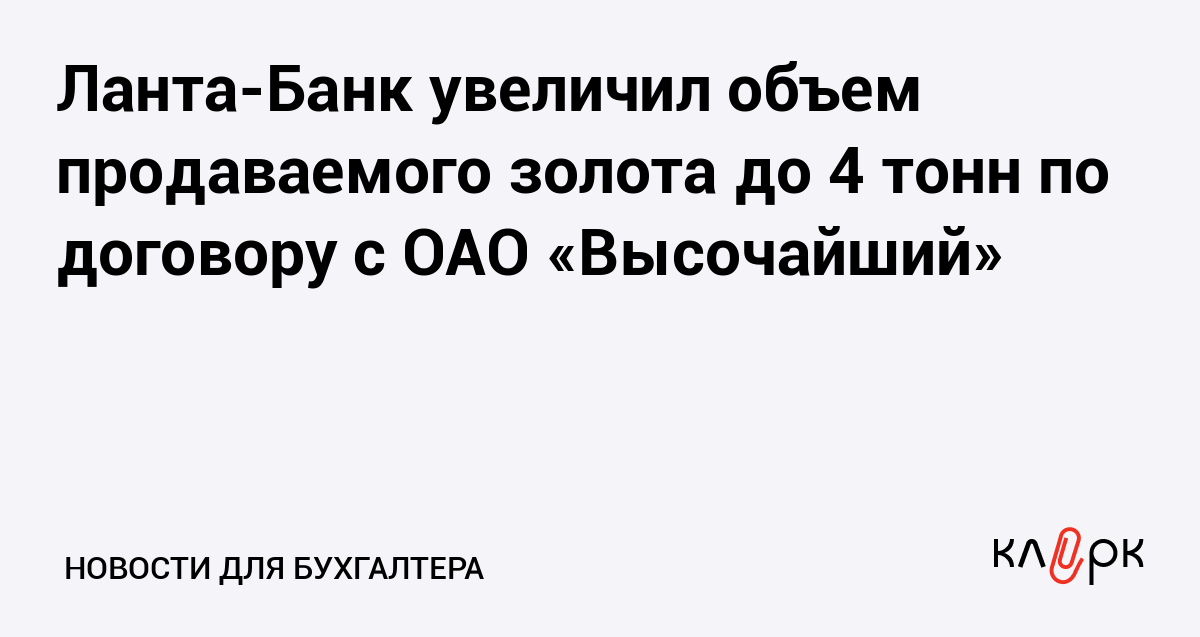 Ланта-Банк сообщил, что заключен новый договор с ОАО «Высочайший» об объеме продаваемого золота. Так, если раньше объем золота (пробы не ниже 99,99) составлял 2,5 тонны, то теперь объем продаж увеличен до 4 тонн. Цена сделки составляет более 2 млрд. рублей.