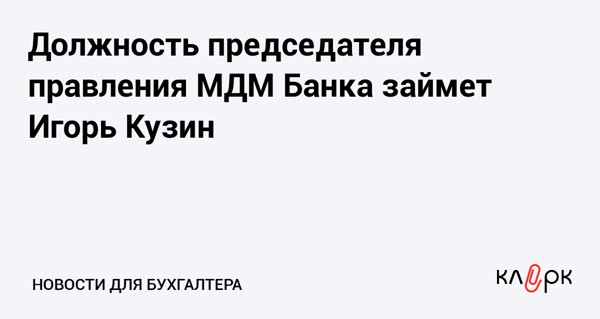 МДМ Банк сообщил сегодня об изменениях в составе его руководства. Должность председателя правления банка займет Игорь Кузин. Именно его кандидатуру рекомендовал совет директоров банка и поддержали все его акционеры. Отметим, что Кузин ранее уже занимал эту должность.