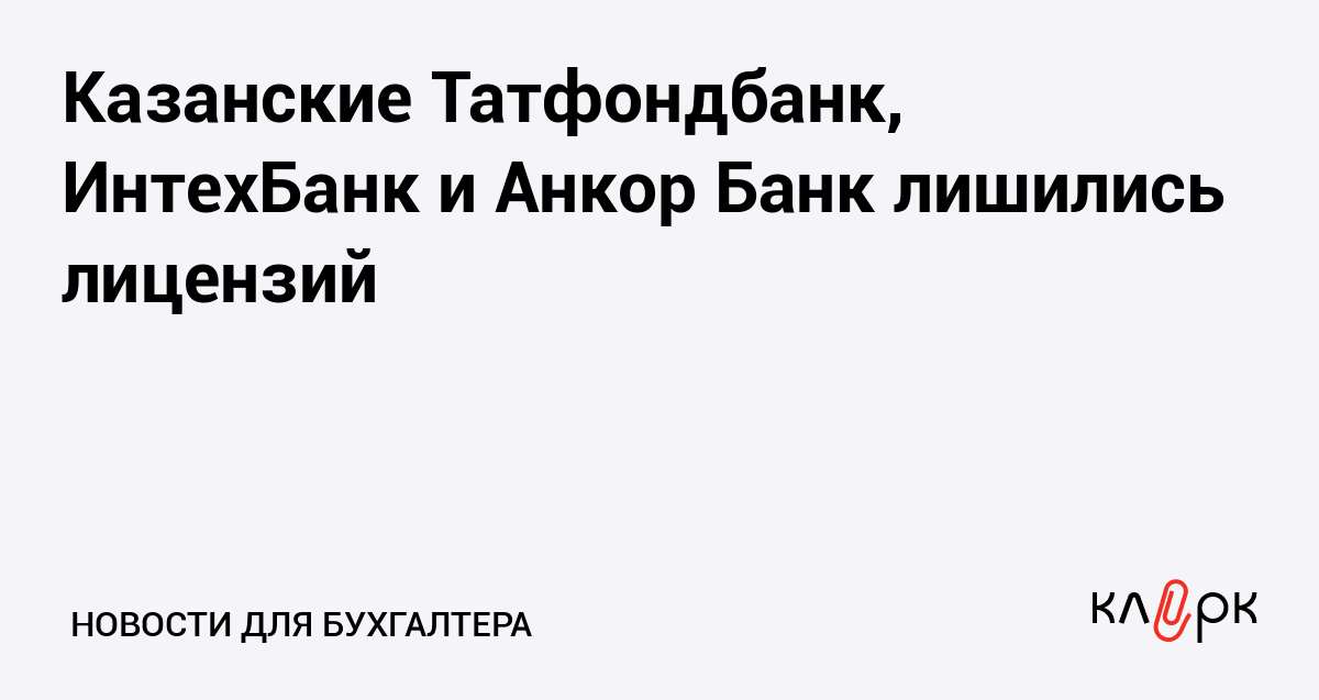 Сегодня ЦБ РФ отозвал лицензии у трех казанских банков АО Анкор Банк, ПАО ИнтехБанк, ПАО Татфондбанк.