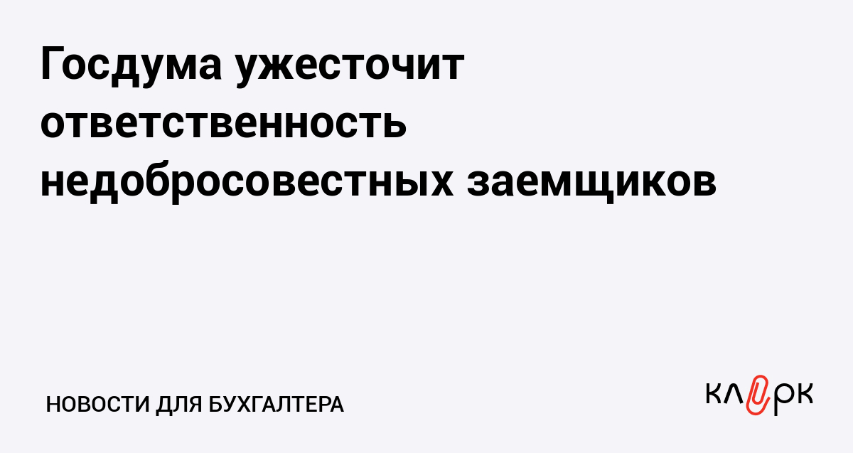 Депутаты подготовили поправки в ряд законов, которыми ужесточается ответственность для недобросовестных заемщиков — физических лиц. В частности, предоставление недостоверных сведений при оформлении договора грозит заемщику штрафом в размере суммы полученного кредита либо лишением свободы на срок до двух лет. Действующая статья 176 Уголовного кодекса и сейчас предусматривает ответственность за незаконное получение кредита, но при этом ограничивает круг потенциальных нарушителей. Таким образом, если физическим лицом, не осуществляющим предпринимательскую деятельность и не являющимся руководителем организации, были совершены действия, подпадающие под определение "незаконное получение кредита", то его невозможно привлечь к ответственности по статье УК.