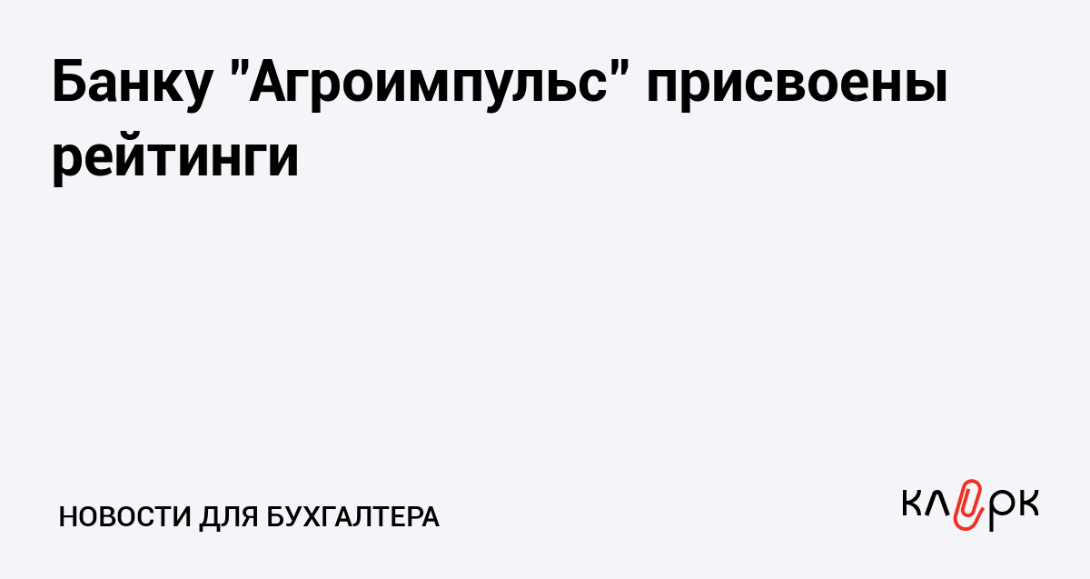 23 ноября 2007 года рейтинговое агентство Moody's Investors Service присвоило ОАО КБ "Агроимпульс" следующие рейтинги по глобальной шкале: В3 по долгосрочным и Not-Prime по краткосрочным депозитам в национальной и иностранной валюте, а также рейтинг финансовой устойчивости (РФУ) на уровне E+. Прогноз по всем рейтингам – стабильный. Одновременно Moody's Interfax Rating Agency присвоило банку "Агроимпульс" долгосрочный кредитный рейтинг по национальной шкале на уровне Baa3.ru. Рейтинги международного рейтингового агентства банк получает впервые.