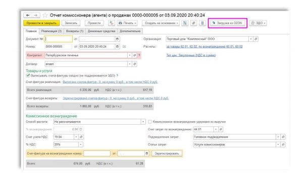 Магазин OZON формирует отчет о реализации товаров за месяц и присылает его не позднее 5-го числа следующего месяца в формате (XLSX). Именно этот отчет загружает данная обработка в документ «Отчет комиссионера (агента) о продажах».