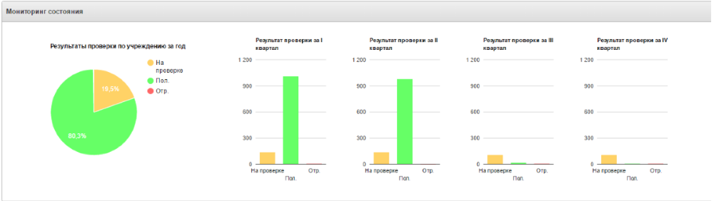 По результатам ВФК в подсистеме формируется отчет о результатах внутреннего финансового контроля. Его можно представить как в табличном виде, так и в графическом. Так наглядно демонстрируется соотношение положительных и отрицательных результатов при проверке: