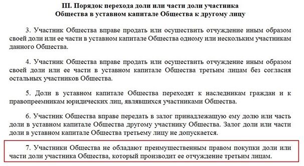 Или, к примеру, нет права у участников отчуждать доли — нет нужды писать о преимущественном праве других участников.