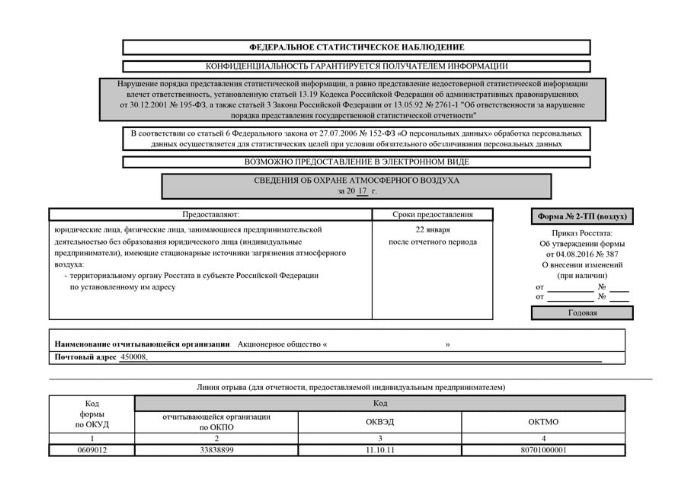Статистическая отчетность об охране атмосферного воздуха – форма 2-ТП (воздух) сдается в Росприроднадзор до 22 января года, следующего за отчетным.