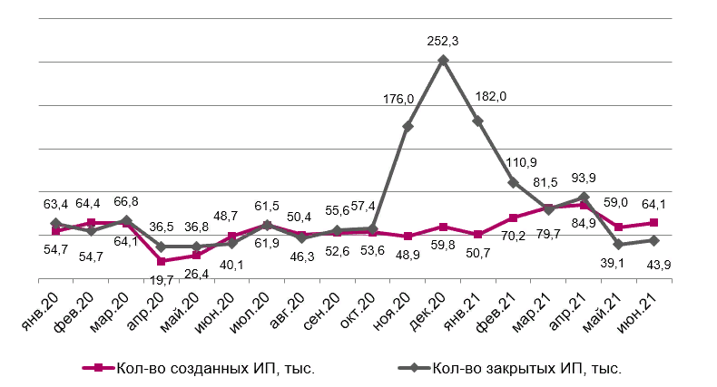 Аналитическая служба международной аудиторско-консалтинговой сети FinExpertiza на основании данных ФНС сделала вывод, что количество закрытых ИП в первом полугодии 2021 почти в два раза превысило ту же метрику в коронавирусном 2020.