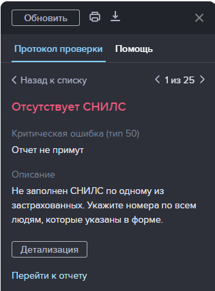 Да, я увидела ошибку, но боже мой — она была написано понятным языком. Ну т. е. не так, как выше, а простым, человеческим: «Не заполнен СНИЛС по одному из застрахованных. Укажите номера по всем людям, которые указаны в форме».