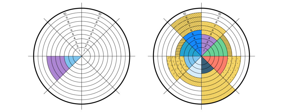 - Закрасьте каждый сектор настолько, насколько эта сфера должна быть развита, чтобы ваша жизнь соответствовала идеальному представлению о ней. Исходите из того, что полный заштрихованный сектор — это 10 баллов из 10 возможного развития. Если вы считаете, что для достижения идеальной картинки вам нужно 7 баллов в каком-то секторе, а в каком-то 2 — значит это и есть ваш баланс и закрасить вам нужно именно так. Каждая сфера в данном случае самостоятельна, не нужно добиваться, чтобы сумма всех секторов была как-то ограничена или количество баллов сочеталось между собой.