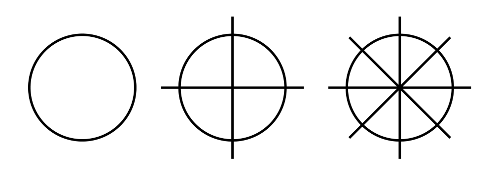 - Нарисуйте круг, разделите его на 4 равные части, затем каждый из получившихся секторов разделите ещё на 2 части таким образом, чтобы круг оказался разделён на 8 равных частей.