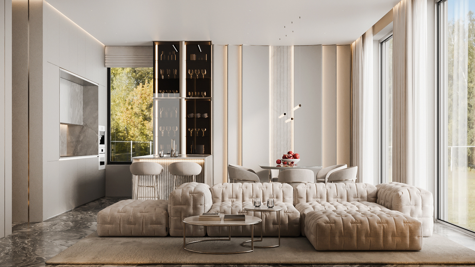 Этот масштабный проект наглядно демонстрирует принцип, когда архитектура диктует правила организации пространства. Семиметровые потолки в гостиной и столовой зоне стали не просто технической характеристикой, а главным художественным элементом современного интерьера. Архитектурные членения фасадов повторились в интерьерных решениях — линиях подсветки, расположении мебели, создавая единый ритм всего пространства. Проект подтверждает, что качественный дизайн интерьера под ключ начинается с грамотного обыгрывания существующей архитектурной основы. Панорамное остекление обеспечивает постоянную связь с городским ландшафтом, а продуманная система хранения сохраняет чистоту линий.