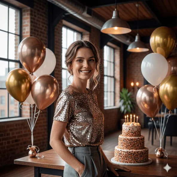 Фотосессия девушки на день рождения (используй мое фото), интерьер лофта, воздушные шары и торт на заднем плане, современный образ, аккуратный макияж, мягкий направленный свет, кадр по пояс, 35mm, ярко но без пересветов, фотореализм, high quality.