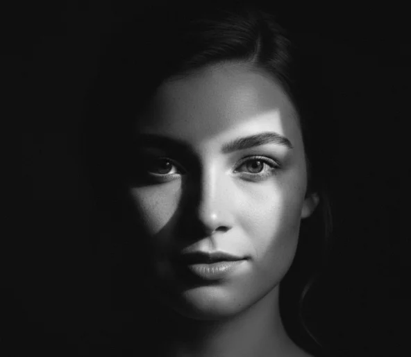 Чёрно-белое фото девушки (используй мое фото), контрастный свет рембрандт, портрет по плечи, эмоция спокойная уверенность, тёмный фон, подчёркнутые скулы и текстура, зерно плёнки, 50mm, художественная фотография, без лишних деталей.