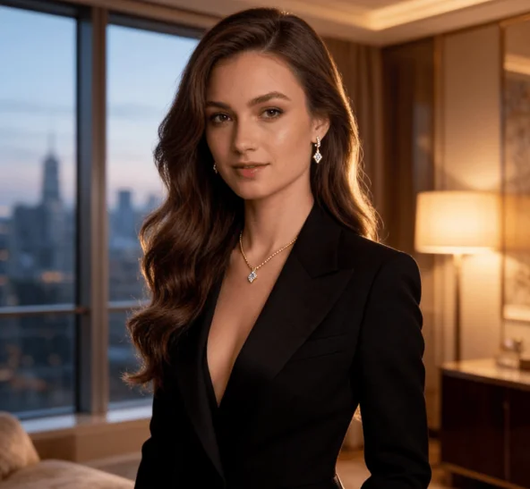 Глянцевая фотосессия девушки (используй мое фото) в стиле luxury, дорогой интерьер отеля или пентхауса, вечернее платье или строгий костюм, украшения (золото/бриллианты), идеальная укладка и макияж, кинематографичный мягкий свет + акцентный контровой, лёгкие блики на украшениях, поза уверенная, кадр по пояс или ростовой, 85mm, высокая детализация, журнальная ретушь, фотореализм, премиальное качество.
