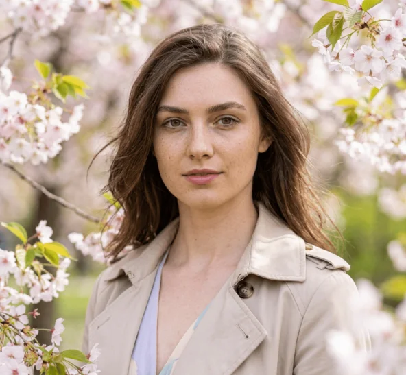 Весенняя женская фотосессия (используй мое фото), парк в период цветения, нежные пастельные тона, лёгкое платье или тренч, естественный макияж, мягкий дневной свет, лёгкий ветер в волосах, полукадр, 50mm, натуральная цветокоррекция, фотореалистично, высокая детализация, аккуратное боке.