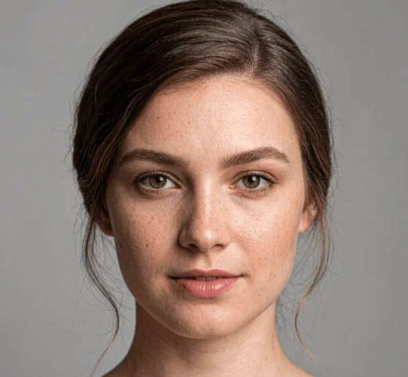 Фотореалистичный студийный портрет девушки (используй мое фото) , крупный план, мягкий рассеянный свет, серый фон, естественный макияж, аккуратная причёска, взгляд в камеру, высокая детализация кожи, 85mm, f/1.8, лёгкое боке, журнальное качество.
