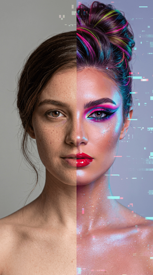 Вертикальное фото 9:16, девушка в кадре по пояс, стиль “вирусный TikTok”, резкий контраст “до/после” в одном изображении: слева натуральный образ без макияжа, справа ультра-гламурный образ с ярким макияжем и необычной причёской, эффект split-screen (разделение кадра), драматичный свет, лёгкий glitch и неоновые отражения, высокая детализация лица, фотореализм, чёткий фокус, современная цветокоррекция, ощущение “вау-превращения”.