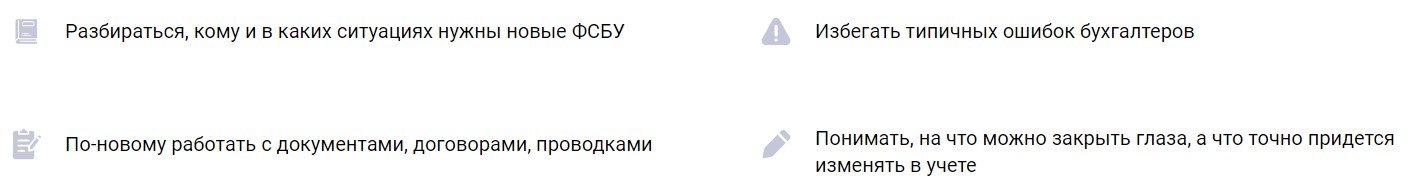 Проходите 6 модулей, становитесь профи в ФСБУ и идете работать со спокойной душой. Еще и раздаточный материал получите, который можно использовать без ограничений.