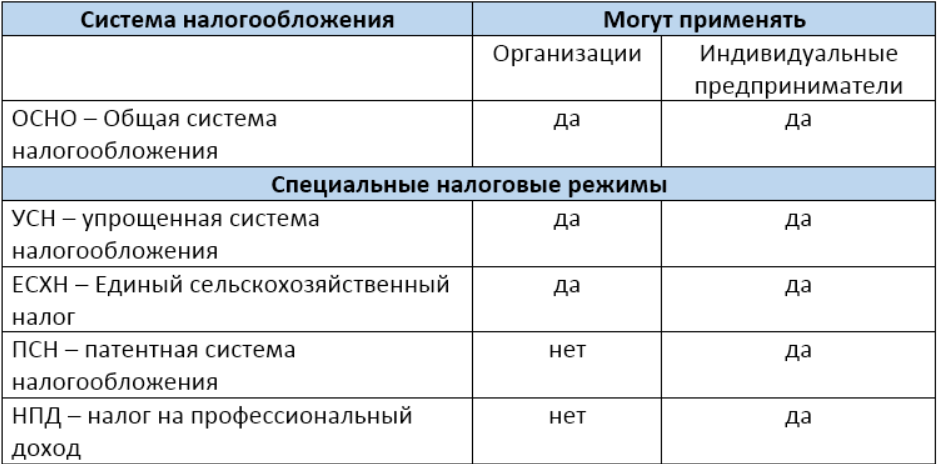 Получается, что и компании, и ИП могут выбрать ОСНО или УСН, а те, кто занят в сельском хозяйстве — еще и ЕСХН. Предприниматели могут также перейти на ПСН и НПД.