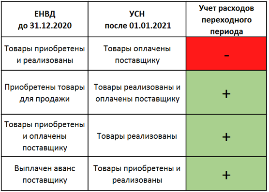 Как было отмечено выше, учесть в расходах стоимость товаров, приобретенных для продажи, можно только при одновременном выполнении условий: товары должны быть оплачены поставщику и реализованы покупателю. Поэтому расходы на приобретение товаров для продажи, понесенные в период применения ЕНВД, можно учесть после перехода по мере их реализации. В Письме ФНС России № СД-4-3/19053@ от 20.11.2020 налоговики разъяснили порядок учета расходов переходного периода.