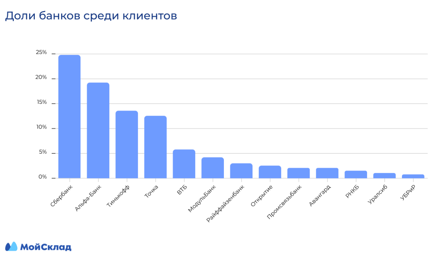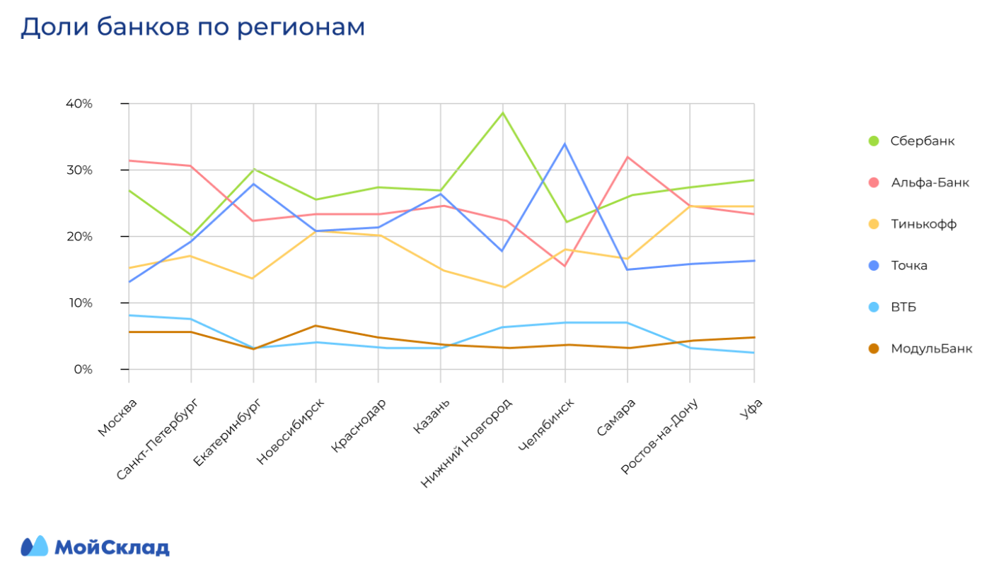 Малый бизнес Челябинска идет против общих тенденций и предпочитает Точку — 33,8%, второе место занимает Сбербанк, заняв только 22,1% от рынка в регионе, третье место челябинцы отдали банку Тинькофф — 18,2%.