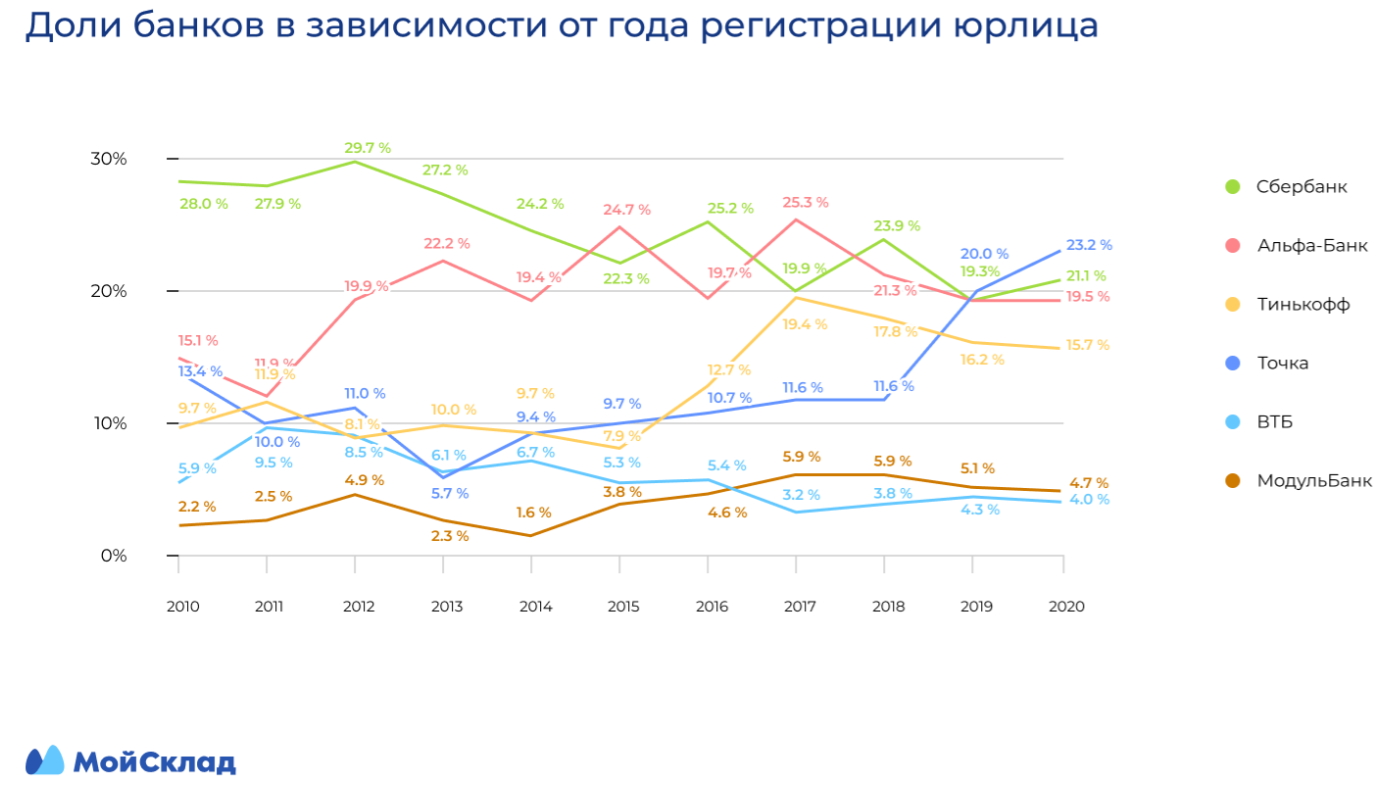 Альфа-Банк борется за «пальму первенства» со Сбербанком с 2014 года. Лидеры меняются каждый год местами вплоть до 2019 года, где в борьбу врывается Точка (20%). В итоге более молодые компании выбирают сразу между четырьмя банками: Точка 23,2%, Сбербанк 21,1%, Альфа-Банк 19,5%, Тинькофф 15,7%.