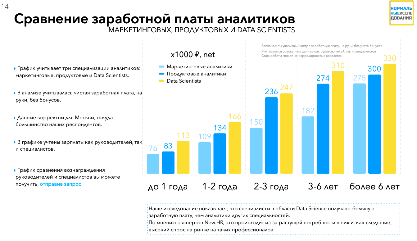 При этом, уровень заработной платы даже у начинающих специалистов очень высокий. Приведем график зарплат по данным исследования компании «Нормальные исследования» и рекрутингового агентства New.HR.