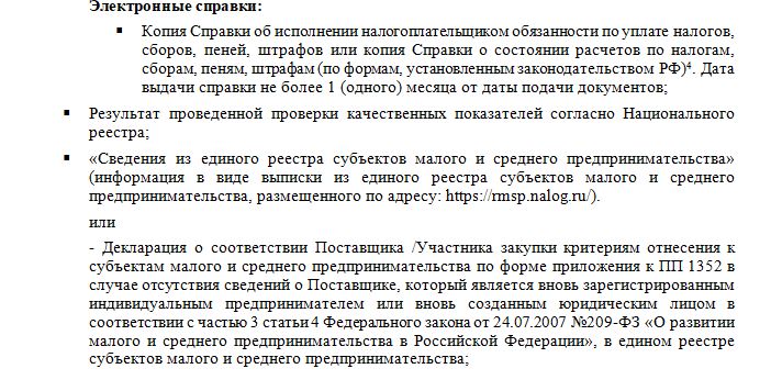 В списке, среди обычных справок и деклараций (например, о принадлежности к МСП), будет и некий загадочный документ. В данном случае на скрине видно, что предлагается представить «Результат проведенной проверки качества показателей согласно Национального реестра»