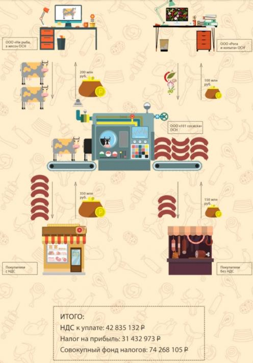 В итоге, годовой доход ООО «101 сосиска» составил 500 млн рублей: 350 млн руб. принесли покупатели на ОСН, а 150 млн – не имеющие дело с НДС. У собственника появилось здоровое желание снизить НДС законными способами…