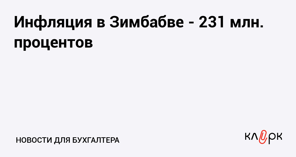 Инфляция в Зимбабве достигла 231 000 000 % в год. Рост темпов инфляции в Зимбабве произошел из-за роста цен на хлеб и зерновые. По оценкам ООН, в продовольственной помощи нуждаются два миллиона зимбабвийцев. Ранее инфляция составляла "всего лишь" 11,2 миллиона процентов, что, впрочем, уже было зафиксировано в Книге рекордов Гиннесса, как самая высокая инфляция в мире.