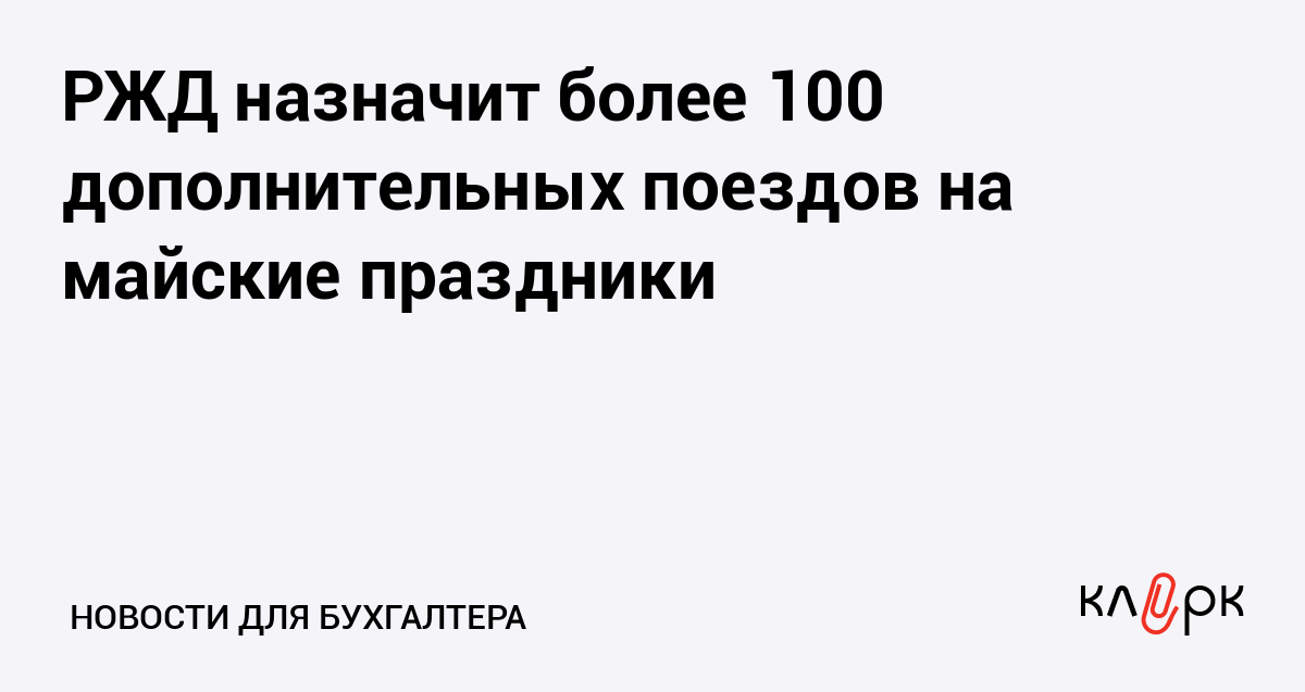 В РЖД сообщают, что ОАО «Федеральная пассажирская компания» назначает более 100 дополнительных пассажирских поездов в период майских праздников: с 29 апреля по 9 мая 2011 года.