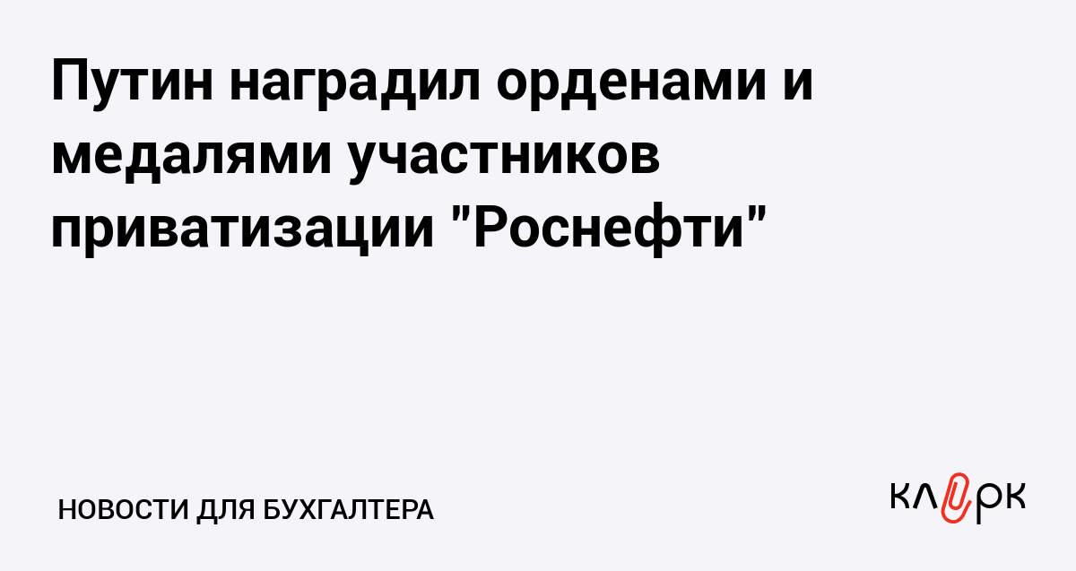 Президент Владимир Путин подписал указ о награждении орденами и медалями ряда иностранных граждан, в том числе участников состоявшейся в конце прошлого года сделки по приватизации 19,5% акций НК "Роснефть".