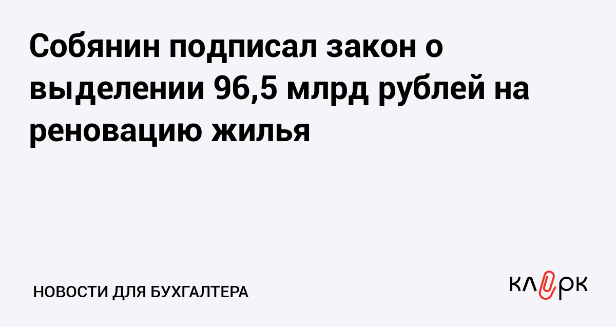 Мэр Москвы Сергей Собянин подписал закон, вносящий изменения в бюджет Москвы на текущий год, по которым увеличивается расходная часть на 96,5 млрд рублей для подготовки реализации новой программы реновации устаревшего жилого фонда