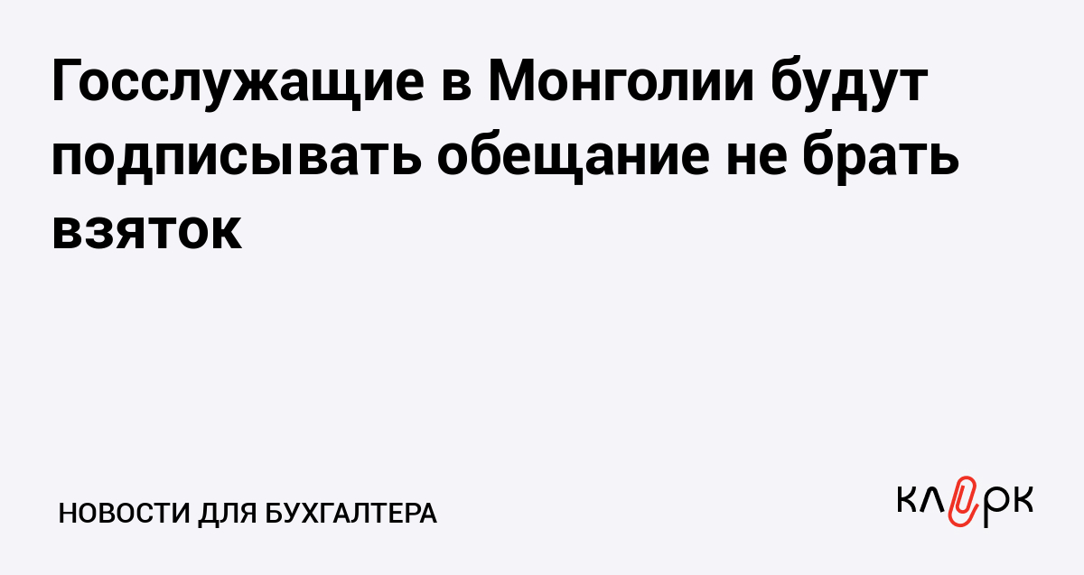 Вскоре все монгольские государственные служащие при поступлении на работу будут давать письменное обещание не брать взятки. Правительство страны приняло решение подготовить проект такого обещания и вынести его на обсуждение парламента.