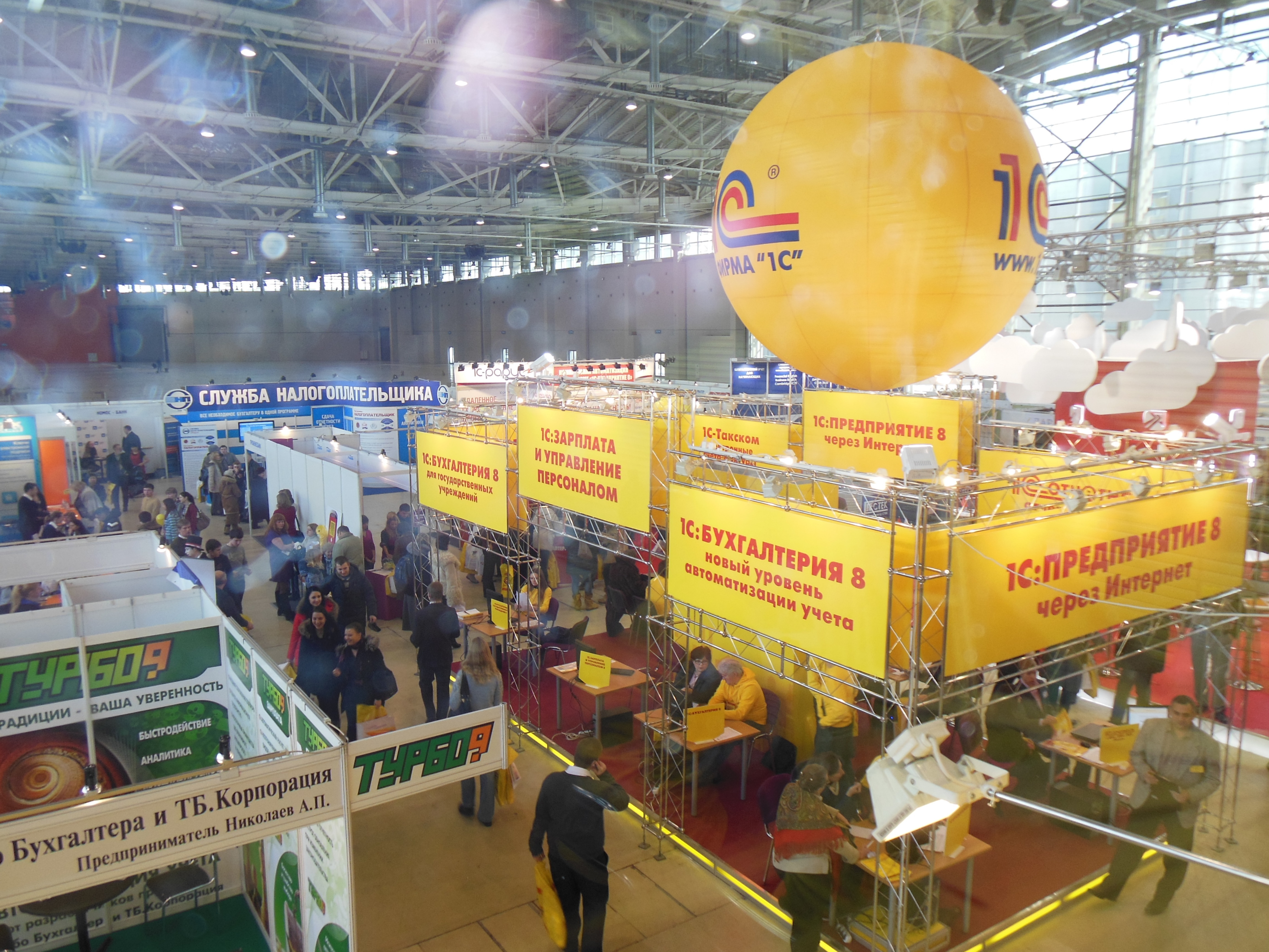 Визуальный размах выставки нас немножко смутил. Огромные площади экспозиций и шоколадные фонтаны, к которым успели привыкнуть посетители прошлых выставок, отсутствовали. Но ситуацию спасали гранды – желтый «мини-городок» 1С, где бухгалтеров угощали шампанским, масштабные стенды «Консультанта», где пришедшим с мороза посетителям наливали кофе, большие стенды «СКБ Контур», «Такскома» и некоторых других участников.