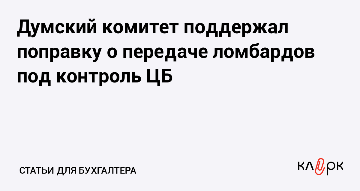 Поправка вносится в статью 76.1 закона «О Центральном банке Российской Федерации (Банке России)», дополняя ломбардами список некредитных организаций, регулирование, контроль и надзор за которыми ведет Центробанк, уточняет «Прайм».