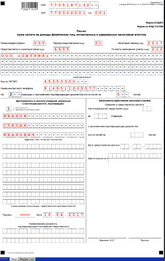Пример заполнения 1 и 2 расчета 6-НДФЛ за 1 квартал 2017 года