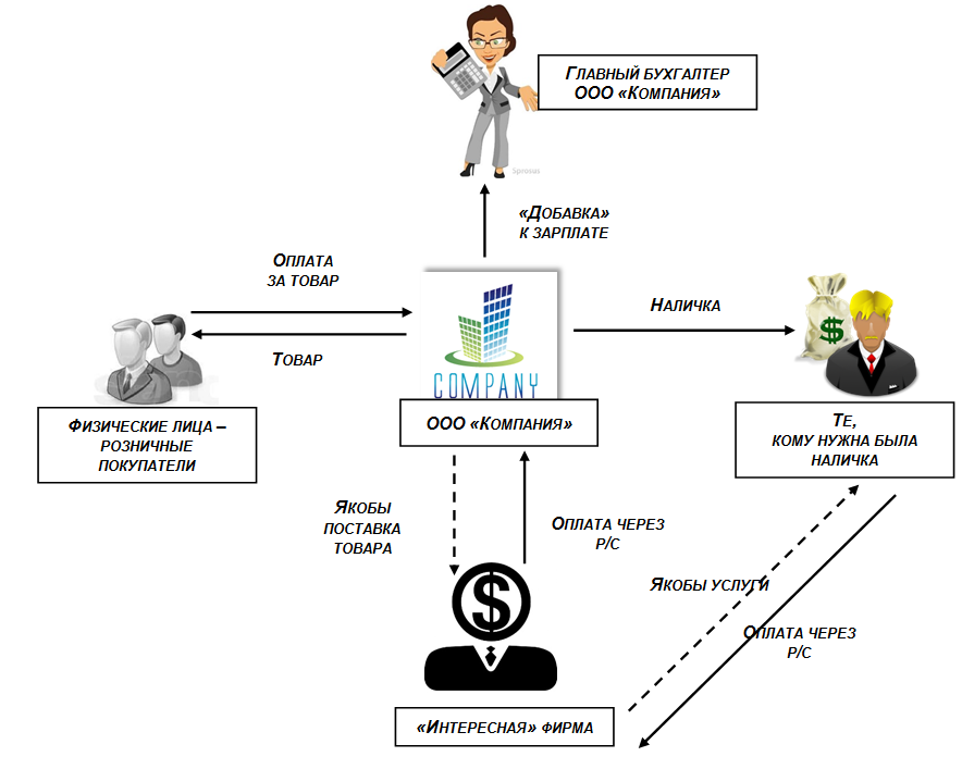 Как выяснилось, у компании, где главбух осуществляла свою деятельность, имелись покупатели - физические лица. Они приобретали это оборудование неофициально за наличный расчет. А по документам оборудование реализовывалось заказчикам обналички - фирмам-однодневкам за безналичный расчет. Ну, а деньги, полученные от физлиц, просто передавались за минусом комиссии заинтересованной стороне (см. схему).